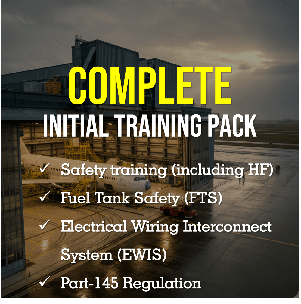 This comprehensive initial training package brings together four mandatory EASA Part-145 regulatory training requirements in a single, cohesive programme: Safety Training (including Safety Management System integration), Part-145 Regulation, Electrical Wiring Interconnection System (EWIS), and Fuel Tank Safety (FTS). Together, these four courses form the complete safety and regulatory training baseline for any Approved Maintenance Organisation (AMO) seeking full regulatory compliance under EASA Part-145.