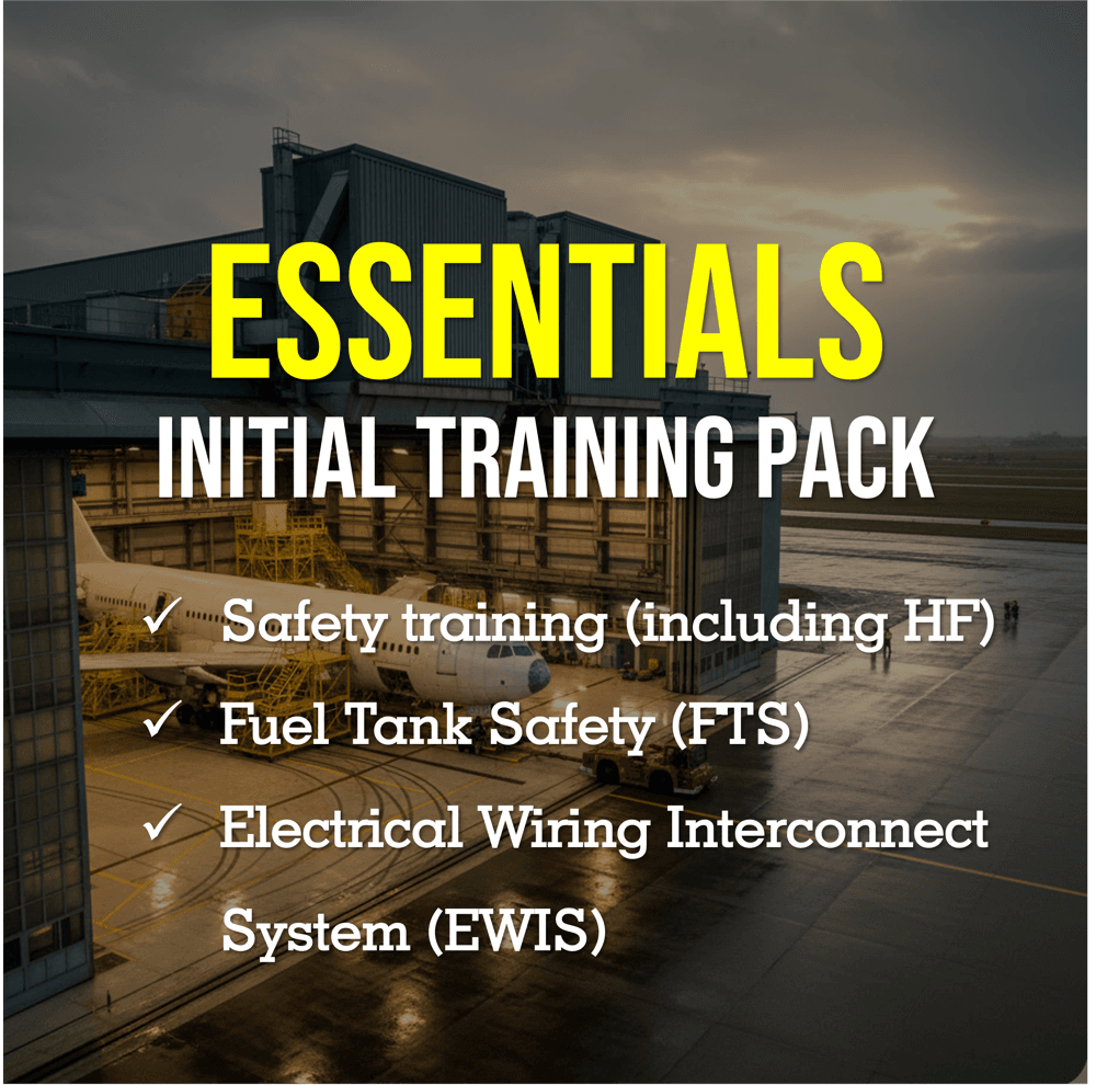 This bundled initial training package brings together three mandatory EASA Part-145 regulatory training requirements in a single, cohesive programme: Safety Training (including Safety Management System integration), Electrical Wiring Interconnection System (EWIS), and Fuel Tank Safety (FTS). Together, these three courses form the essential safety training baseline for any Approved Maintenance Organisation (AMO) seeking full regulatory compliance under EASA Part-145.